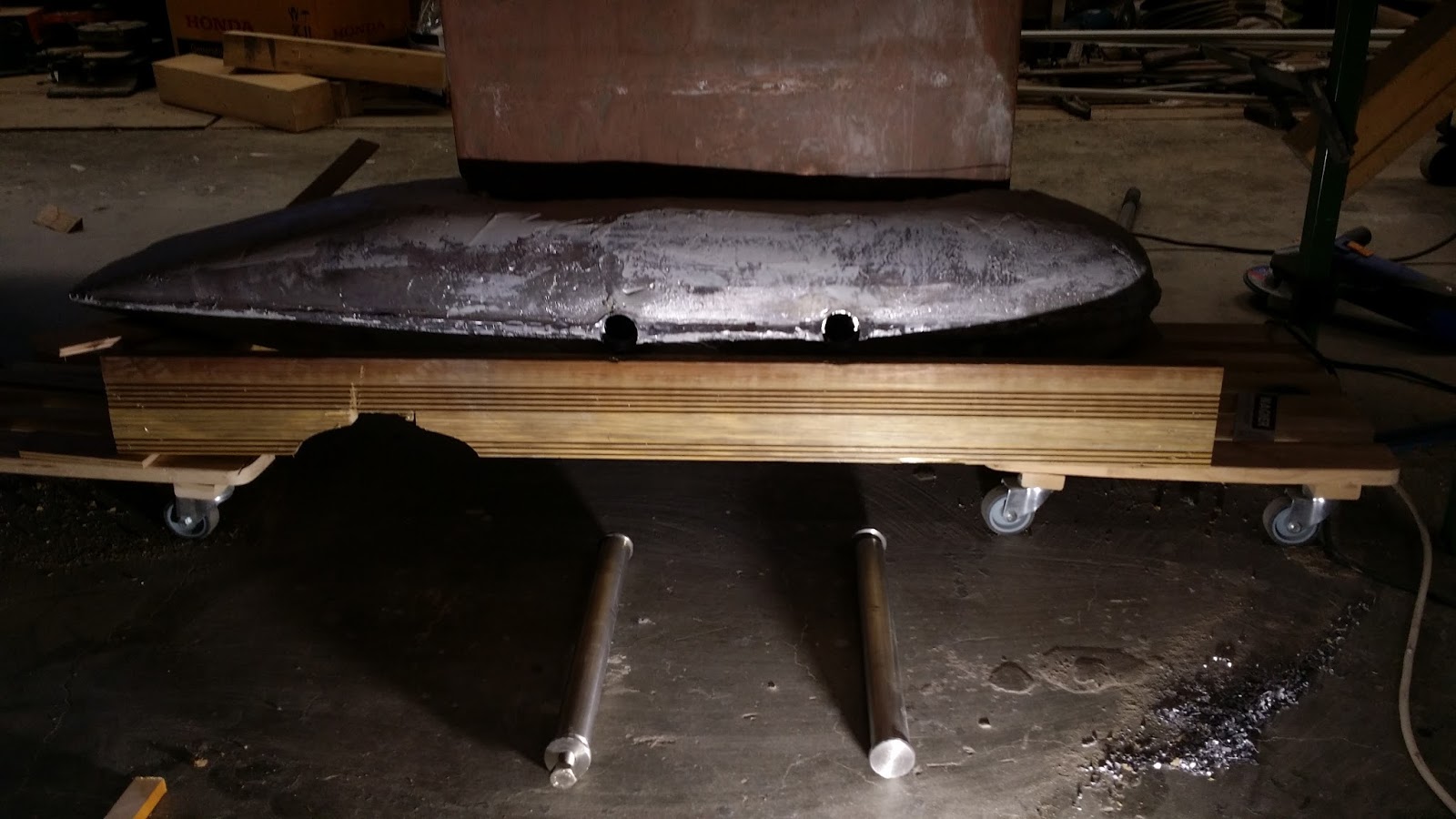 - Auch der Kiel wäre mit mehr Harz besser dran gewesen. Er klemmte schliesslich so, dass ich Angst hatte er werde den Kielkasten sprengen. Nun wurde er in einer Werft in Kiel ausgebaut: Bleibombe mit der Kettensäge längs durchgeschnitten, dann mit Hau-Ruck (Wagenheber und Kran) noch oben herausgezogen: Das Laminat konnte man einfach abwickeln! Eiche und Epoxy ist keine gute Kombination. Mahagony wäre besser gewesen. Die Finne musste über Wochen (bis in die nächsten Ferein hinein) getrocknet werden, es war sogar die Frage, ob man sie nicht ganz ersetzen solle. Nun wird sie aufgerauht und neu laminiert.